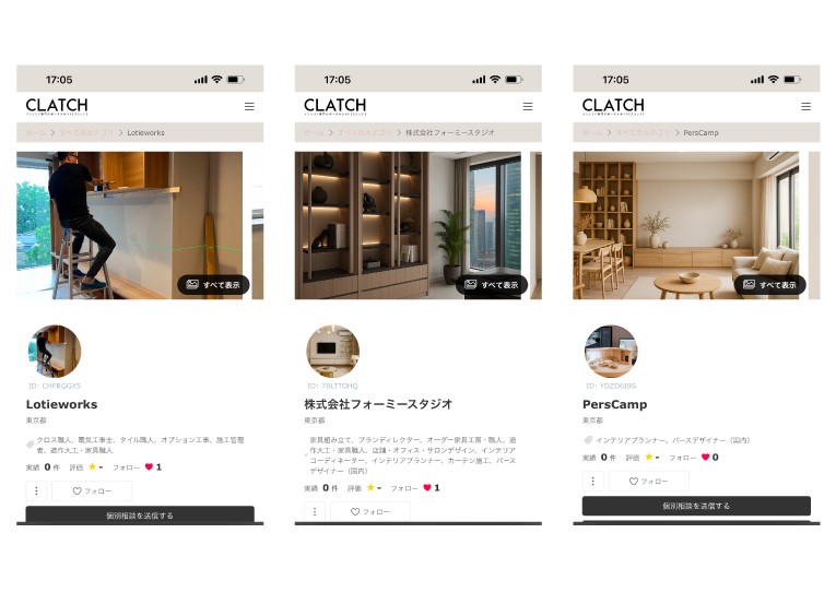 コーディネートだけでなく、コーチングやパース、オーダー制作、プロが選ぶ職人など様々なプロに直接相談。知識や経験豊富なプロに相談する事で結果的にコストダウンになる事も!専門家の選択に迷ったらまずはクラッチにご相談ください。